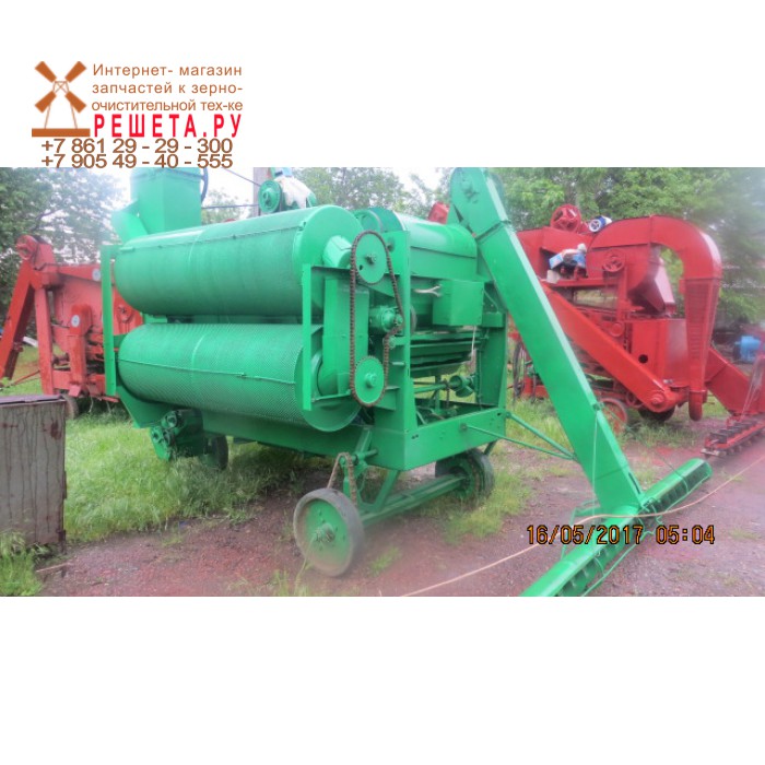 Сбоку машины установлено два триера: верхний 14 — для удаления коротких примесей, нижний 15— для удаления длинных примесей. Длина цилиндров 1960 мм, диаметр 600 мм. Каждый цилиндр имеет неразъемную триерную обечайку и две розетки. Задняя розетка цилиндра для удаления коротких примесей выполнена в виде подъемного колеса. Колесо имеет три черпаковых лепестка, которыми материал и сбрасывается в течку. Передняя розетка цилиндра для удаления длинных примесей имеет кольцо-диафрагму для создания слоя «подушки» и, следовательно, уменьшения потерь в отходы. Лотки цилиндров опираются на разборные валы триера через подшипники скольжения. Валы имеют шнековую навивку внутри лотков. Материал в триерных цилиндрах перемещается по оси плужками, укрепленными на стенке лотков (цилиндры на раме установлены горизонтально).